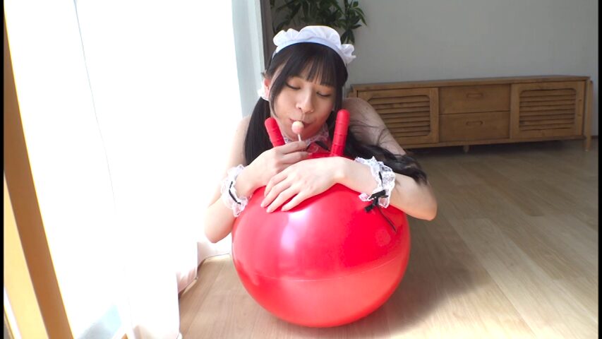 エプロンを脱ぐと、バランスボールの上で足を開いたり、飴舐め。