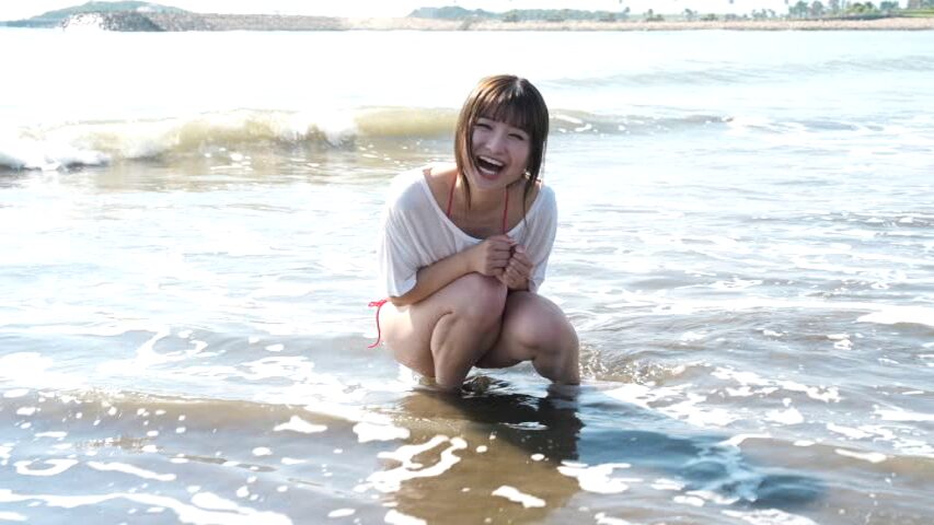 Tシャツ姿で海に出るとかわいいピンクのビキニになって、満面の笑みではしゃぎます。