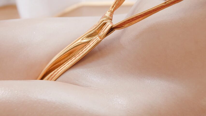最初はゴールドの水着のシーンから始まり、美しい体を披露しています。