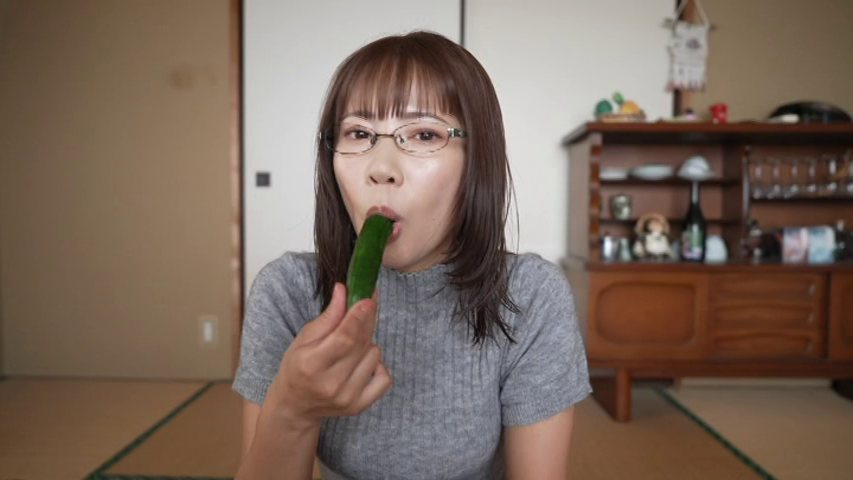 つまみのキュウリを口に咥えだして、今度は人形相手に騎乗位になって腰を振り出します。